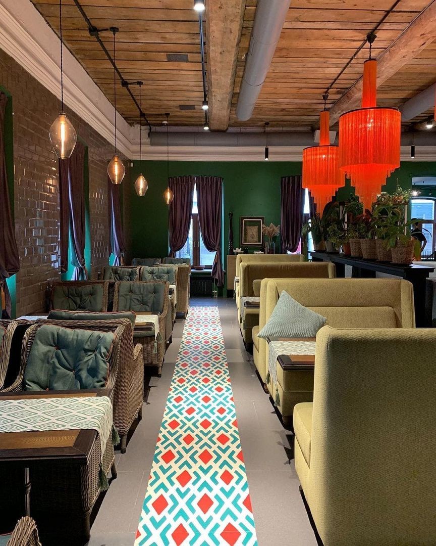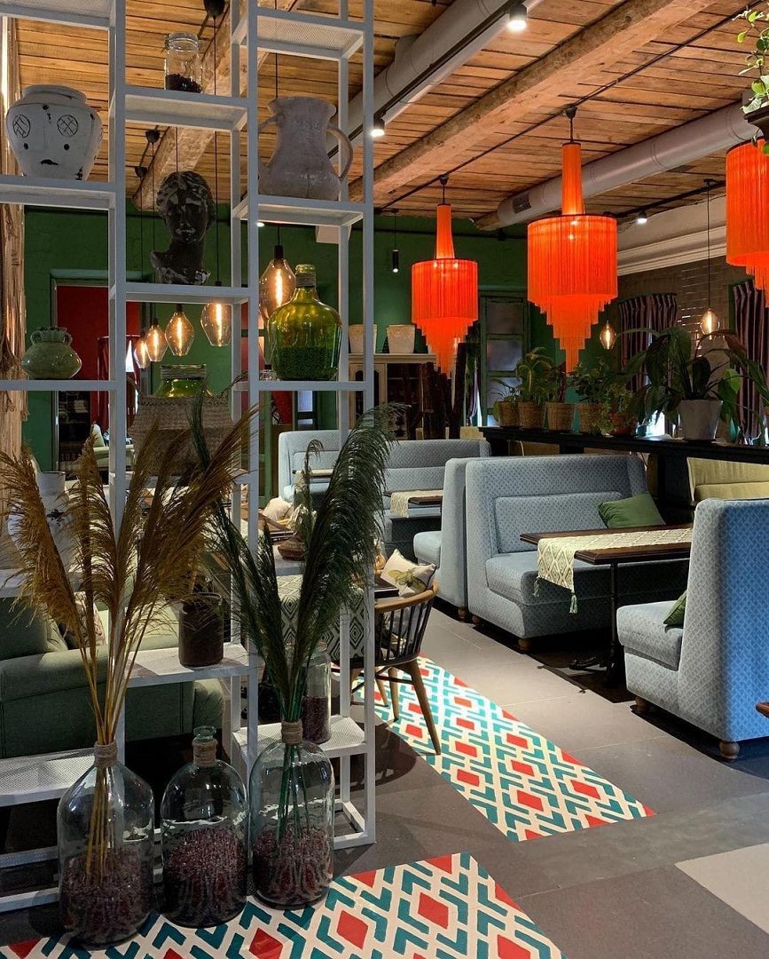 Автором проекта является известный уральский ресторатор Евгения Левандовская. В заведении колоритный интерьер. На входе красуется яркое изображение трёх грузинских красавиц в национальной одежде. Внутри два зала - большой и малый. Стены помещений выкрашены в зелёный цвет. Потолок обит деревянными досками. С него свисают оранжевые абажуры. На полу выложена плитка серого цвета с узорчатой дорожкой. Особую атмосферу и уют создают элементы декора: старинный сервант, полки с глиняными кувшинами и стеклянными сосудами, растения в горшках, свечи на подоконниках, занавески на окнах из плотной ткани.